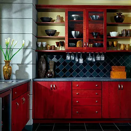 Make a bold statement with red-stained cabinets. If red belongs anywhere in the home, it belongs in the kitchen. This vibrant color delivers a robust, flavorful hue that emulates red peppers, cranberries, plump tomatoes, or a family-secret spaghetti sauce recipe. However, as a dominating color, red does best in kitchens with minimal adornment and little natural light.